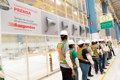 ROTEIRO – Após a apresentação de um vídeo sobre a companhia, os visitantes são convidados a realizar a montagem de carros da Toyota em versão miniatura. Em seguida, o plant tour conduz os participantes a vivenciarem uma experiência imersiva na linha de produção, conhecendo todos os detalhes do Sistema Toyota de Produção (TPS) no processo de montagem do novo Corolla. Com o conhecimento adquirido durante a visita, o grupo realiza uma nova montagem das miniaturas. Nesta etapa, todo o conhecimento adquirido na visita pode ser aplicado na prática.