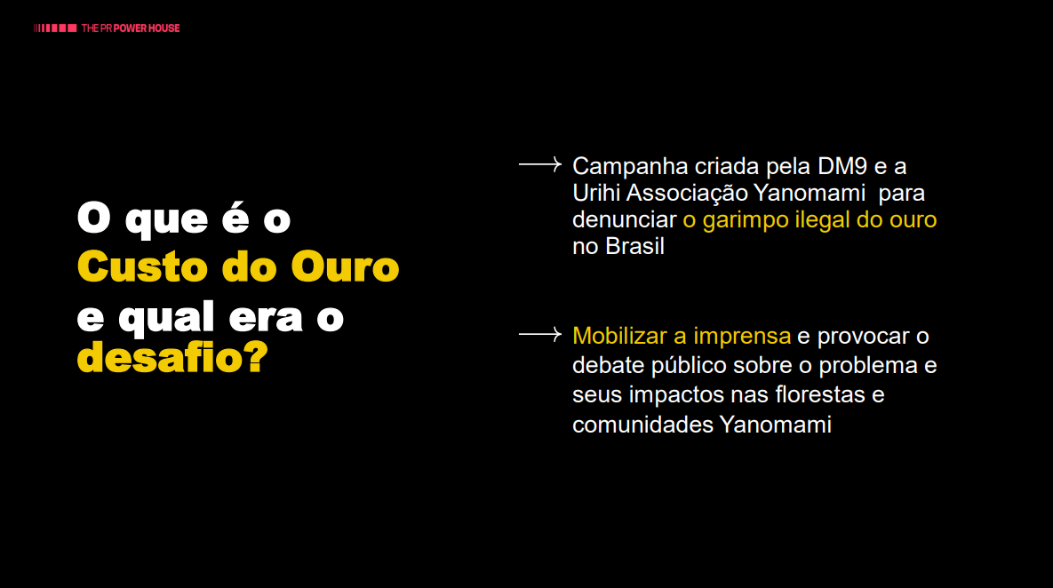 Com o objetivo humanitário de mobilizar a imprensa e provocar o debate público sobre o garimpo de ouro ilegal no Brasil e os impactos que isso acarreta nas florestas e nas comunidades Yanomami, a DM9, junto com a Urihi Associação Yanomami, criou a campanha “Custo do Ouro”. O case foi desenvolvido em razão do atual cenário desse tipo de atividade no país. Basta lembrar que o maior território indígena do Brasil, que pertence à comunidade Yanomami, tem passado nos últimos anos por uma crise sem precedentes.