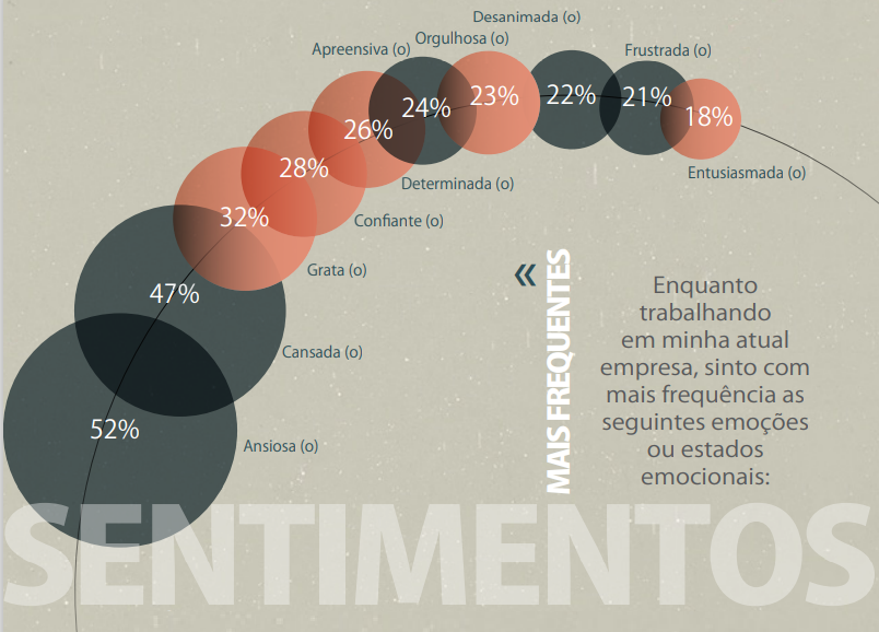 Os pesquisados elencaram as emoções que sentiam com mais frequência no ambiente de trabalho. Dos dez estados emocionais mais assinalados, cinco correspondem a sentimentos ligados às necessidades não atendidas, sendo que os dois mais identificados são ansiedade e cansaço, com 52% e 47% respectivamente, seguidos de apreensão, desânimo e frustração. Um fator que pode explicar esses resultados é a falta de empatia, que aparece na pesquisa como prática importante para 89% dos colaboradores. Quando as necessidades são atendidas, os sentimentos que surgem são despreocupação, segurança, calma, realização e satisfação, ou seja, os menos mencionados na pesquisa.