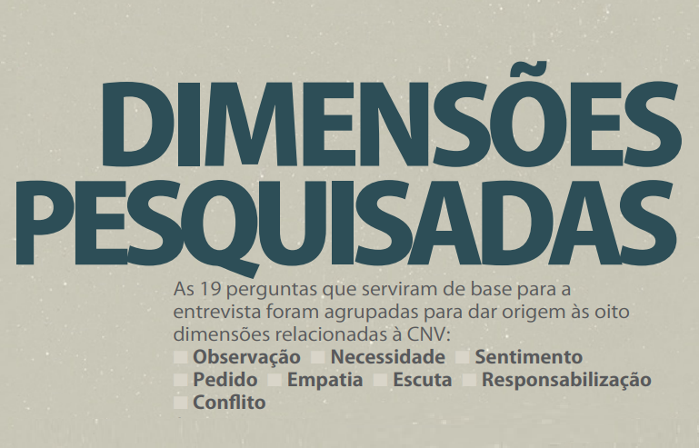 Os pesquisadores esclarecem que não se trata de uma pesquisa sobre o uso da CNV propriamente dita porque isso pressuporia que as organizações já a praticam. O que foi investigado é o quanto as pessoas, equipes e lideranças têm consciência do valor e quanto praticam alguns dos componentes mais importantes dessa metodologia: empatia, escuta, observação, sentimento, atendimento de necessidades, formulações de pedidos, responsabilização e tratamento de conflito.