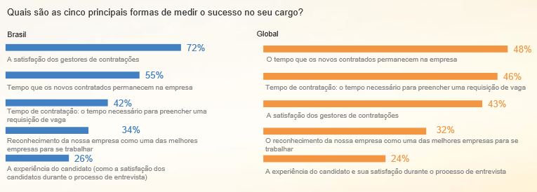 OUTROS RESULTADOS – Em termos de métricas de desempenho, os recrutadores tendem a se concentrar naquelas com um impacto duradouro sobre os negócios. Isso é especialmente verdadeiro no Brasil, onde os recrutadores dão mais atenção aos parâmetros relacionados às contratações (como a satisfação do gestor de contratações e o tempo que novos contratados permanecem na empresa) do que no resto do mundo, onde o tempo de contratação ainda está entre as duas maiores métricas.