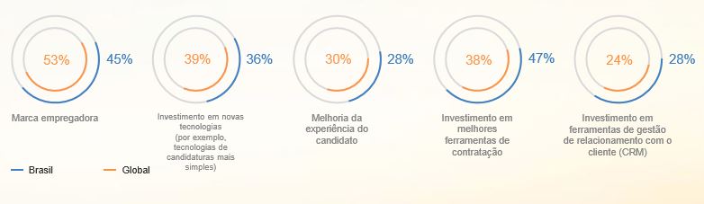 - Mesmo investindo em táticas tradicionais de recrutamento, a maioria das equipes têm a marca empregadora e as melhores ferramentas de aquisição de talentos no alto de sua lista de desejos. Embora aproximadamente 59% dos orçamentos de recrutamento sejam gastos em sites de empregos, ferramentas de recrutamento e agências de emprego, os líderes de talentos identificam melhores ferramentas de aquisição de talentos (47%) e marca empregadora (45%) como as duas áreas principais em que poderiam investir mais.