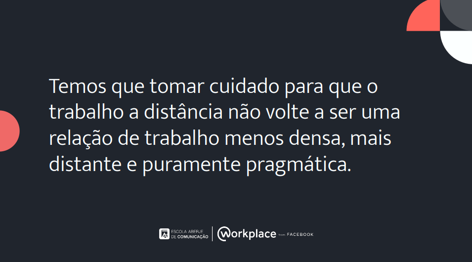 A questão de uma jornada fixa de trabalho, com horário fixo e cobrança por horas tende a diminuir cada vez mais. “O trabalho do futuro chegou mais cedo, e se adaptar à ele requer rapidez, humanização e deixar de lado a percepção de que as pessoas são regidas pela obediência e entender que agora somos regidos pelo desempenho. Temos que tomar cuidado para que o trabalho a distância não volte a ser uma relação de trabalho menos densa, mais distante e puramente pragmática”, alerta.