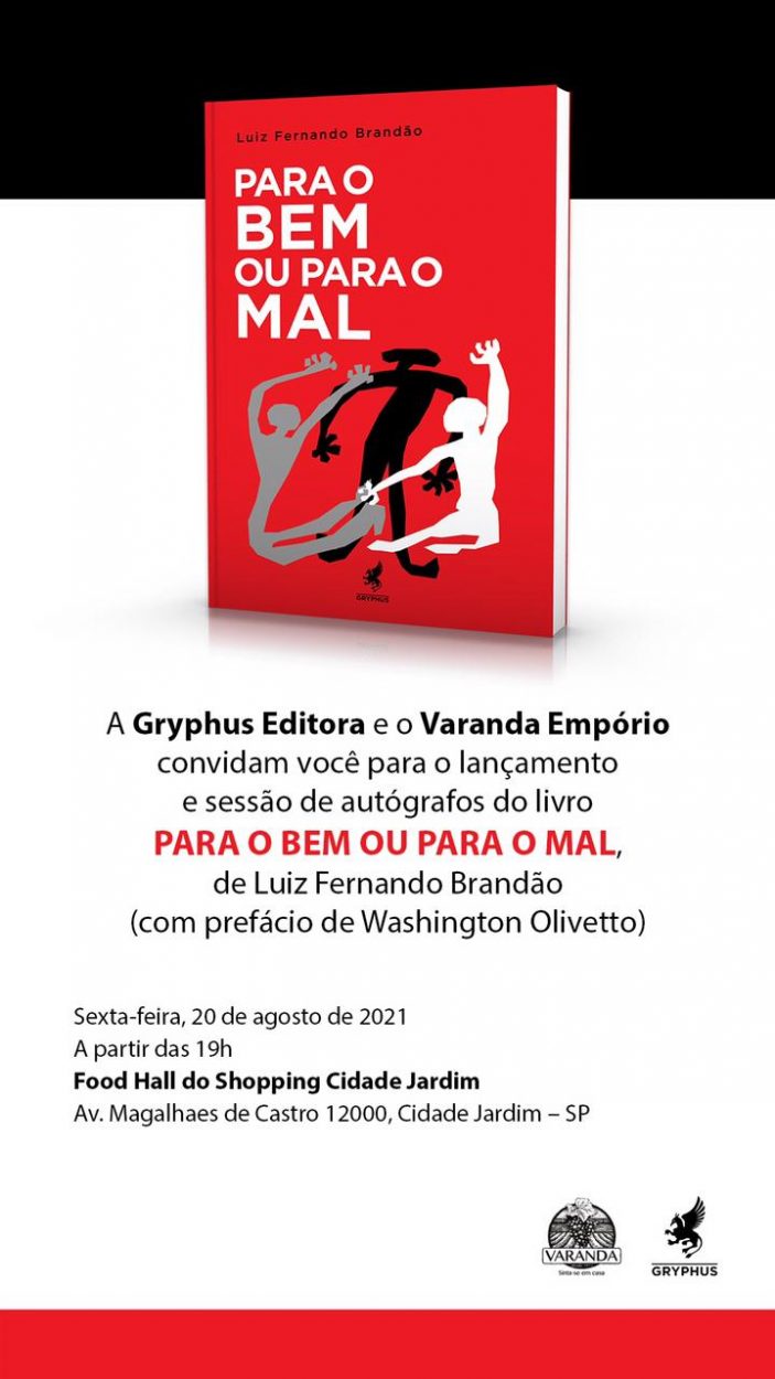 Assim, o superpremiado publicitário Washington Olivetto abre o prefácio de “Para o bem ou para o mal”, estreia na ficção do jornalista, tradutor e escritor Luiz Fernando Brandão, que terá uma noite de autógrafos em São Paulo no próximo dia 20 de agosto, a partir das 19 h, no Varanda Empório, Food Hall do shopping Cidade Jardim.