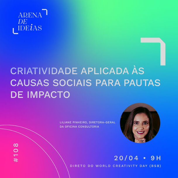 O Arena de Ideias vai transmitir, nesta quinta (20), a palestra da diretora-geral da Oficina Consultoria, Liliane Pinheiro, que será realizada no World Creativity Day, o maior festival colaborativo de criatividade do mundo. Em pauta, a função da criatividade e da metodologia para gerar impactos de transformação social, com iniciativas autênticas e conectadas às questões urgentes para a sociedade.