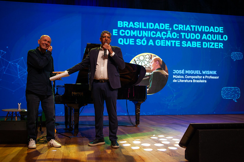 A 9ª edição do Aberje Trends terminou com uma aula-show que traduziu, em palavras e sons, uma das principais mensagens do encontro: comunicar exige sensibilidade, escuta e empatia. O convidado para encerrar o evento foi o músico, compositor e professor de literatura brasileira José Miguel Wisnik, que conduziu o público por um percurso poético sobre a linguagem, a música e a cultura como fundamentos da nossa maneira de nos comunicar. Wisnik já trabalhou com músicos como Tom Zé e Caetano Veloso, além de produzir trilhas sonoras para o grupo Corpo e também para o Teatro Oficina.