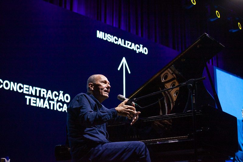 Combinando reflexões literárias e apresentações musicais, Wisnik explorou o que há de singular na produção cultural brasileira e como ela se relaciona com o modo como construímos sentido e conexão. Para ilustrar o repertório da aula-show com exemplos, ele tocou músicas como “Garota de Ipanema”, “Drão”, “O Que Será” (“À Flor Da Terra”) e “Anjos Tronchos”. “A canção envolve musicalização e oralização, em um balanço entre fala e música. Se é muito falada ou muito musicada, deixa de ser canção”, explicou, citando a teoria do músico, linguista e professor Luiz Tatit. Segundo ele, essa capacidade de equilibrar som e sentido confere à canção brasileira uma poeticidade rara, um poder que atravessa gerações e fronteiras.