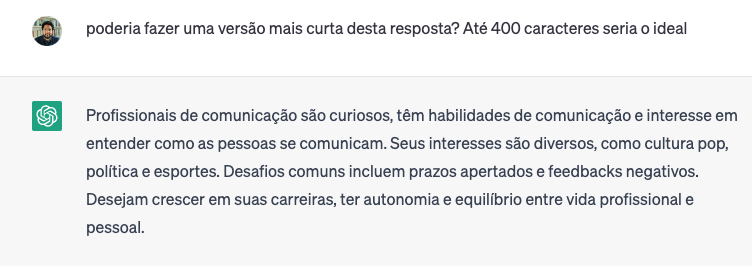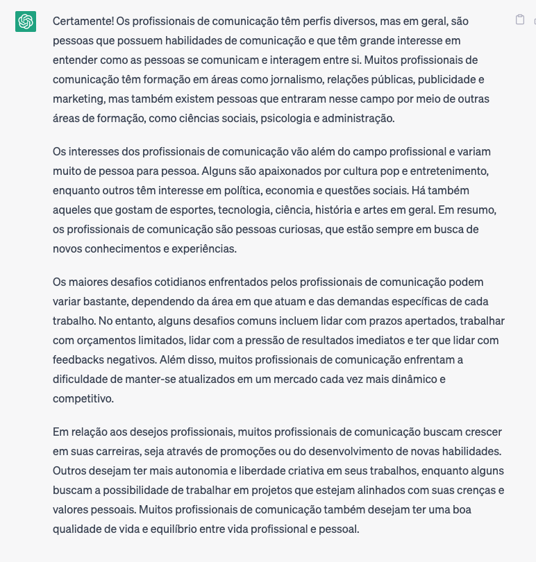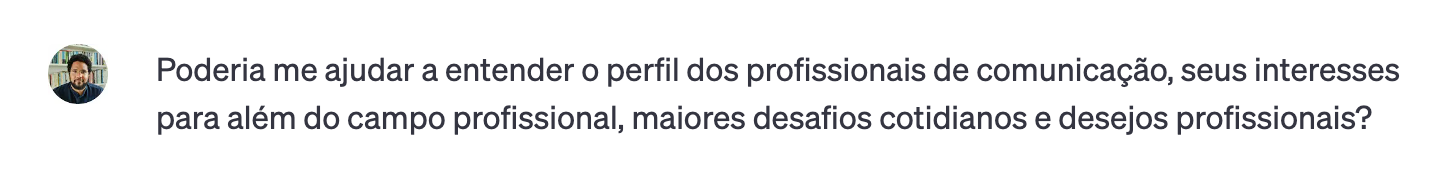 Vamos começar com um uso prático da ferramenta que está no hype: o ChatGPT. Uma forma bem inteligente de utilizá-lo é para ajudar a pessoa de comunicação a compreender características de seu público, tanto demográficas, como comportamentais, além das necessidades e anseios. Vejamos um exemplo: