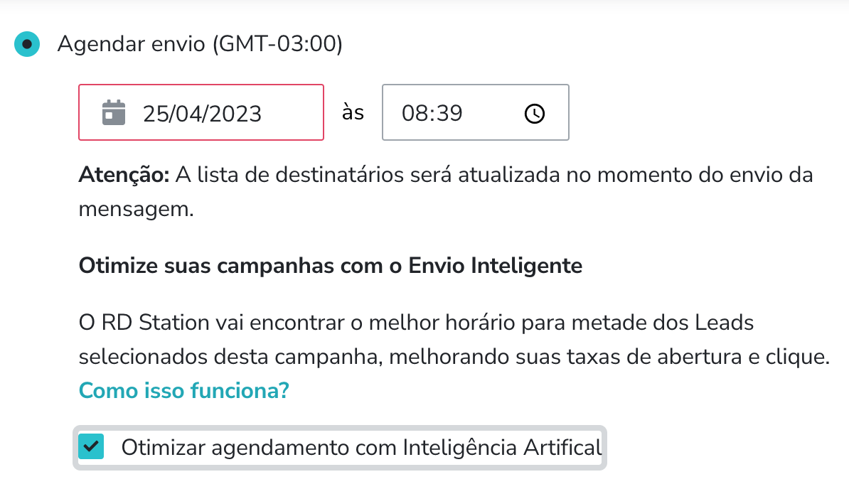 De maneira similar, a plataforma de CRM RD Station oferece a possibilidade de que a definição do momento do envio das mensagens seja definida pela IA, a fim de enviá-la quando o público tiver maior propensão de abri-la.