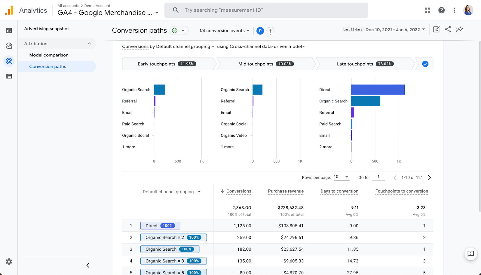 De maneira similar, é possível ativar o modelo de atribuição “data-driven”. Ele busca entender como os diferentes canais de comunicação contribuíram para uma conversão. Com essa informação, o profissional de comunicação pode tomar melhores decisões sobre como alocar seus recursos.