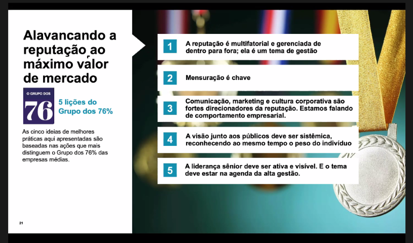 Na ocasião, Araújo apresentou um estudo feito com a participação de organizações de 22 países “que quantifica um valor atribuído à reputação notavelmente alto e mostra como é necessário um nível feroz de atenção a um conjunto sem precedentes de fatores para que as marcas permaneçam em alto grau de consideração e evitem a erosão da reputação”, sintetiza.