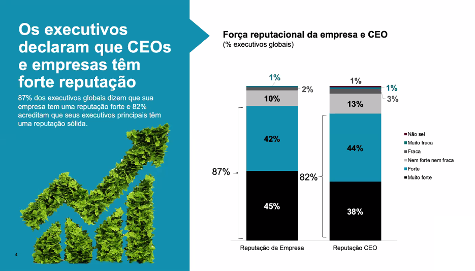 Sobre a força reputacional das organizações, a pesquisa aponta que 87% dos executivos globais declaram que sua empresa tem uma reputação forte e 82% acreditam que seus executivos principais têm uma reputação sólida. Outro ponto diz respeito ao impacto da reputação no valor de mercado: em média, os entrevistados atribuem 63% do valor de mercado à reputação geral da companhia. No Brasil, esse número chega a 76%. “O peso da percepção de valor de uma marca está diretamente atrelado à reputação que nós, comunicadores, estamos gerindo todos os dias”, comentou.
