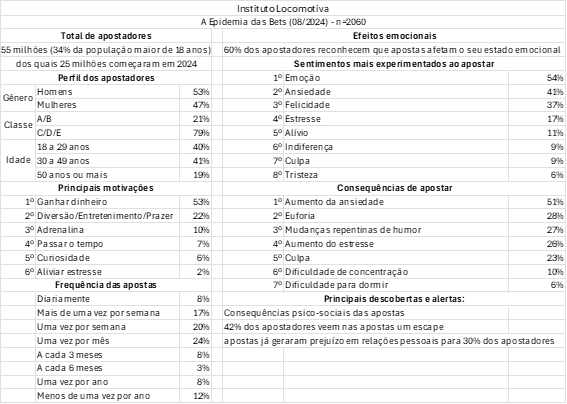 Destaco três alertas do estudo: 1. as apostas têm consequências psico-sociais, nem sempre desejáveis, 2. mais de 40% dos apostadores que respondem à pesquisa veem nas apostas um escape, e 3. 30% dos apostadores que responderam relataram ter enfrentado algum tipo de prejuízo nas relações pessoais. Os principais dados estão no quadro resumo a seguir: