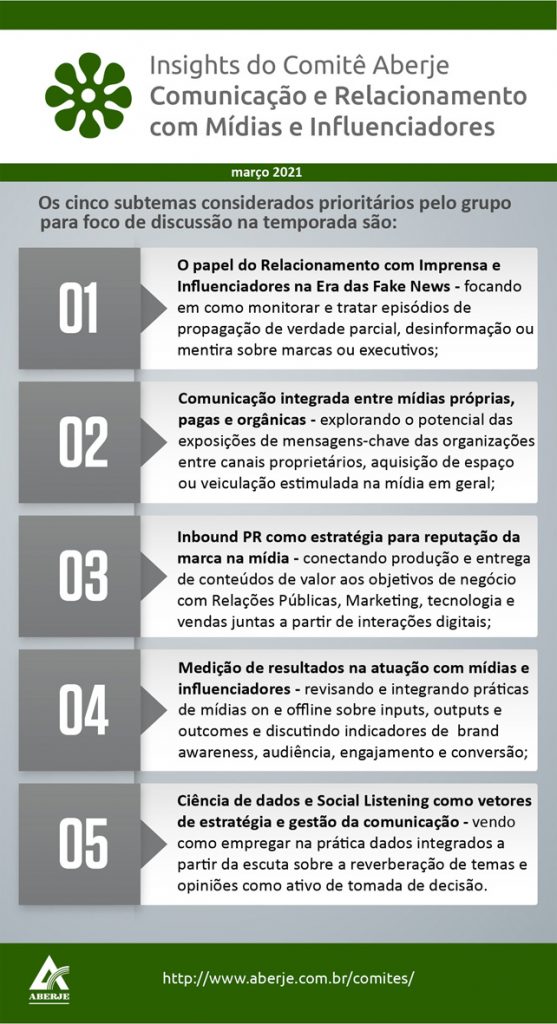 Os insights gerados nos comitês temáricos da Aberje são compartilhados com outros associados e com interessados em geral pelos canais da entidade, e são arquivados no link www.aberje.com.br/comites – onde também estão armazenados os resumos dos comitês de 2020.