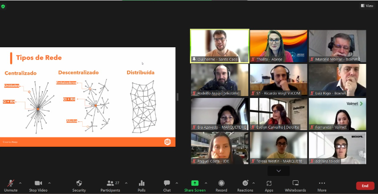 Ao abrir a reunião, Rodolfo Araújo comentou sobre o conceito de descentralização na comunicação como um sintoma de algo mais amplo. “A gente pode associar a descentralização com outros universos que se conectam com a comunicação. Em termos de redes, a descentralização nos remete inevitavelmente à tecnologia, como o blockchain, por exemplo”, disse. “Quando a gente fala de blockchain, estamos falando da transferência do controle de uma entidade centralizada – que pode ser uma pessoa, um grupo ou uma organização – para uma rede distribuída”, completou.