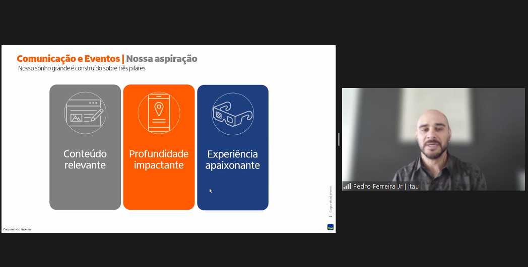 Como estrutura, a equipe de comunicação do banco se organiza a partir de três pilares: (1) entregar conteúdos relevantes, (2) numa profundidade que vai fazer a diferença lá na ponta e (3) proporcionar experiência para o colaborador. “De alguma forma a gente entra mais ou menos em cada um deles para garantir que desse conteúdo e a efetividade da nossa comunicação seja aderente aos objetivos da empresa”, comentou Ferreira.