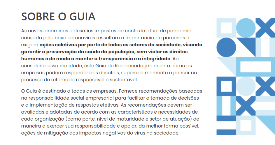 O Guia “Enfrentando a pandemia com responsabilidade social: guia para empresas – recomendações na perspectiva da responsabilidade social em contexto de pandemia” é uma publicação da Covid Radar destinada a livre uso por todas as empresas. Fornece recomendações baseadas na responsabilidade social empresarial para facilitar a tomada de decisões e a implementação de respostas efetivas. Acesse o link aqui