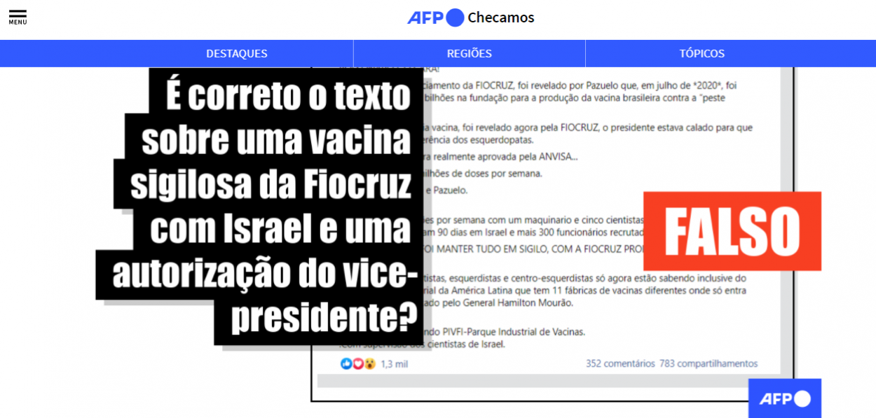 Uma mensagem que afirma que a Fiocruz estaria produzindo, em sigilo, o ingrediente farmacêutico ativo (IFA) e uma vacina, que já seria 100% nacional, e contaria com a supervisão de cientistas de Israel, foi compartilhada mais de 4,5 mil vezes nas redes sociais desde o último dia 19 de março. Além disso, o texto indica que só poderiam entrar na fábrica pessoas autorizadas pelo vice-presidente, o general Hamilton Mourão. À AFP, a Fiocruz e a assessoria do vice-presidente desmentiram essas alegações.