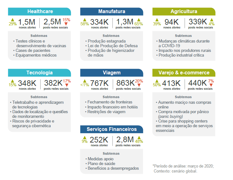 A partir desse trabalho de análise de cenário e de estudo de tendências, a equipe elaborou um dashboard executivo com os principais temas, mensagens-chave de companhias e líderes globais e volume de conversas online e off line geradas no último mês.