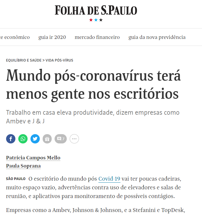 Trabalho em casa eleva produtividade, dizem empresas consultadas na matéria “Mundo pós-coronavírus terá menos gente nos escritórios”, publicada no Jornal Folha de S.Paulo. Acesse o link aqui