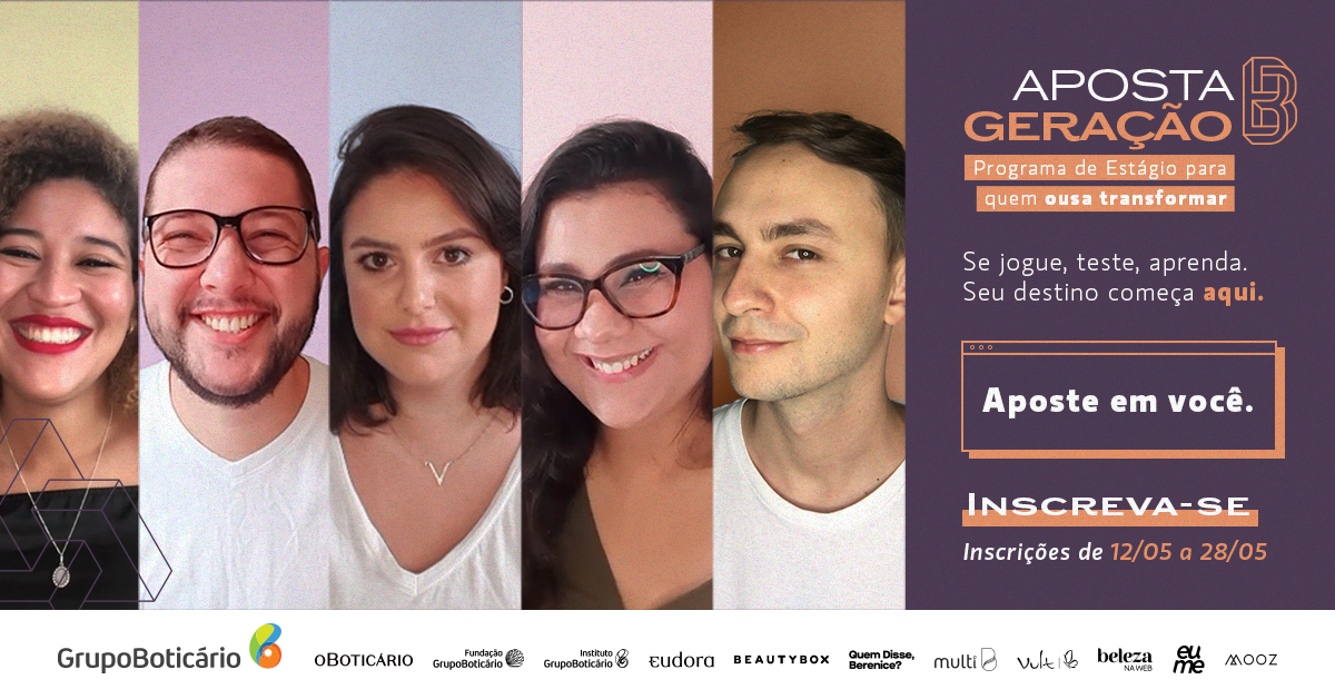 O Grupo Boticário abre hoje as inscrições para processo seletivo de seu programa de estágio 2021. Até 28 de maio, estudantes de todo o Brasil que queiram transformar o mundo por meio da beleza terão a chance de se inscrever na segunda edição do “Geração B”. Ao todo, serão 22 vagas em Negócios, Marketing & Comunicação, Operações, e Pesquisa & Desenvolvimento.