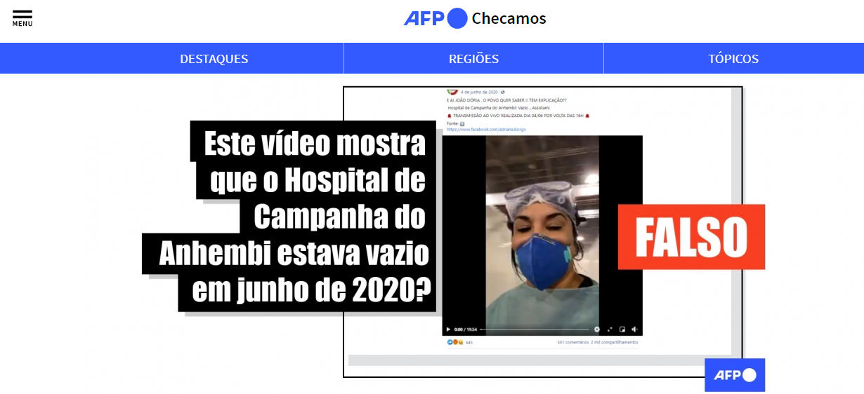Uma gravação na qual uma deputada estadual mostra o Hospital Municipal de Campanha do Anhembi, em São Paulo, criado para atender pacientes com covid-19, e afirma que a instalação está vazia, foi compartilhada mais de 4,5 mil vezes nas redes sociais em junho de 2020 e começou a circular em outros idiomas em 2021. Mas essa alegação é falsa. Segundo a Secretaria Municipal da Saúde, foram filmadas áreas que ainda não estavam ativadas e, naquela data, “havia 397 pacientes na enfermaria [e] 10 em estabilização”.