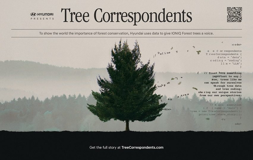 A campanha “Tree Correspondents” utiliza IA para contar a história das árvores em primeira pessoa, com base em dados ecológicos reais que foram transformados em narrativas usando um Large Language Model (LLM, ou Grande Modelo de Linguagem) personalizado. Com o tema “Começando com o primeiro milhão”, a campanha reafirma o compromisso da Hyundai de continuar seus esforços ecológicos para além do marco de um milhão de árvores plantadas.