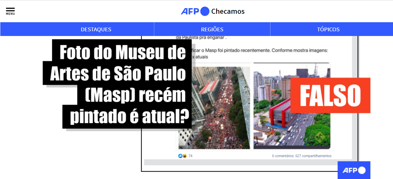 Publicações que supostamente provam que eram antigas as fotos da Avenida Paulista atribuídas nas redes ao ato realizado no último dia 29 de maio contra o presidente Jair Bolsonaro foram compartilhadas mais de de 6,9 mil vezes em redes sociais. As postagens se baseiam em uma foto que mostraria como o Museu de Arte de São Paulo (Masp) foi “pintado recentemente”. Esse registro é, no entanto, anterior a 2012, quando foi finalizada a obra de um edifício ao lado do museu.