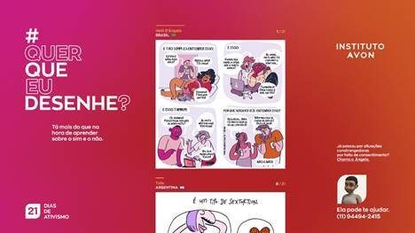 Durante a pandemia de Covid-19, o mundo virtual ganhou ainda mais relevância, permitindo que o trabalho e o relacionamento com amigos e familiares fossem mantidos por meio das plataformas digitais. No entanto, a esfera digital também se fortaleceu como espaço em que a violência contra as mulheres se propagou em vídeos e fotos compartilhados sem a autorização. Para educar sobre o consentimento no mundo virtual, e também fora dele, o Instituto Avon lança no Brasil e em mais 13 países da América Latina a campanha #querqueeudesenhe, ou #sinohaysíesno para os latinos. Por 21 dias, sete ilustradores de diferentes países produzirão tirinhas em português e espanhol para reflexão sobre o tema, a ação é parte da campanha “21 Dias de Ativismo pela Não-Violência contra a Mulher”.