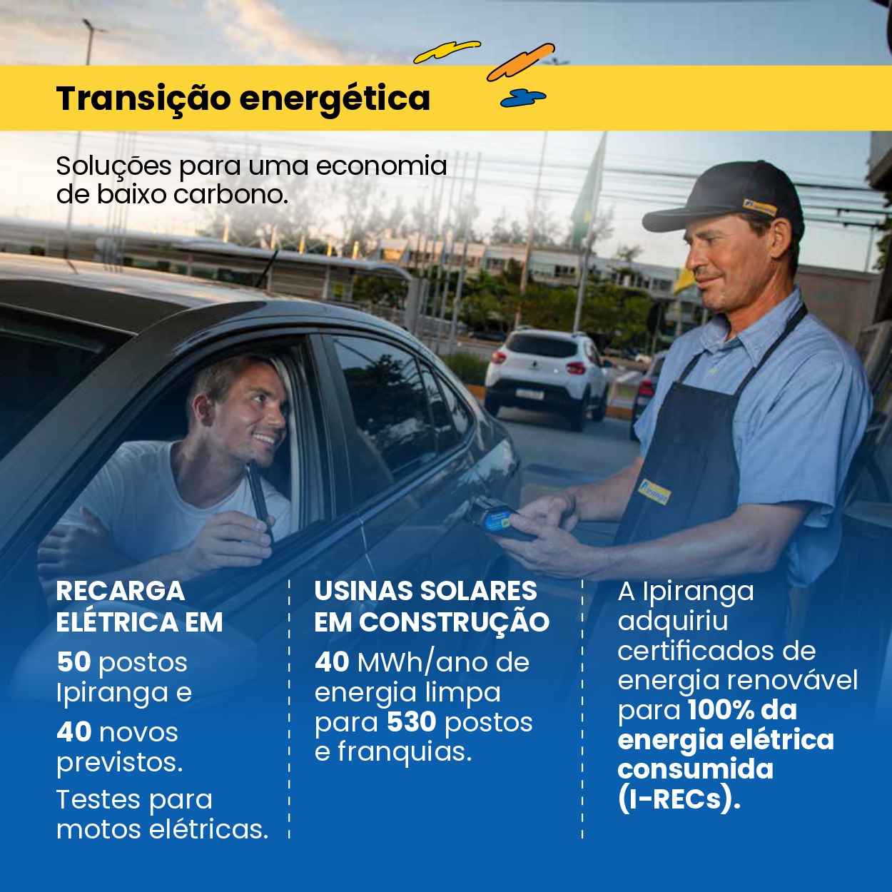 Em 2021, a Ipiranga reduziu suas emissões totais de carbono em 3% e destinou R$ 176 milhões à compra de Cbios, créditos de descarbonização. A companhia ainda adquiriu os primeiros certificados de energia renovável (I-RECs), provenientes da geração eólica, para compensar o volume de energia consumido no ano passado.