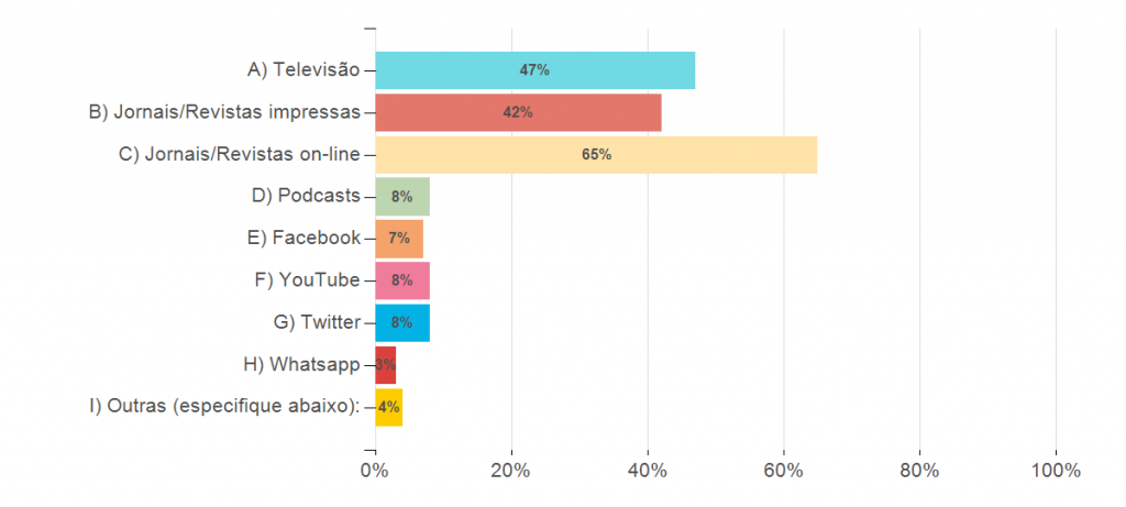 Em primeiro lugar na lista das fontes de informação estão os jornais e revistas online (67%), seguidos por Facebook (65%), televisão (58%), Whatsapp (45%) e Youtube (43%). Mas, apesar de utilizarem as redes sociais para este fim, a maioria acredita que os jornais e as revistas (online e impressos), além da televisão, são os meios mais confiáveis.