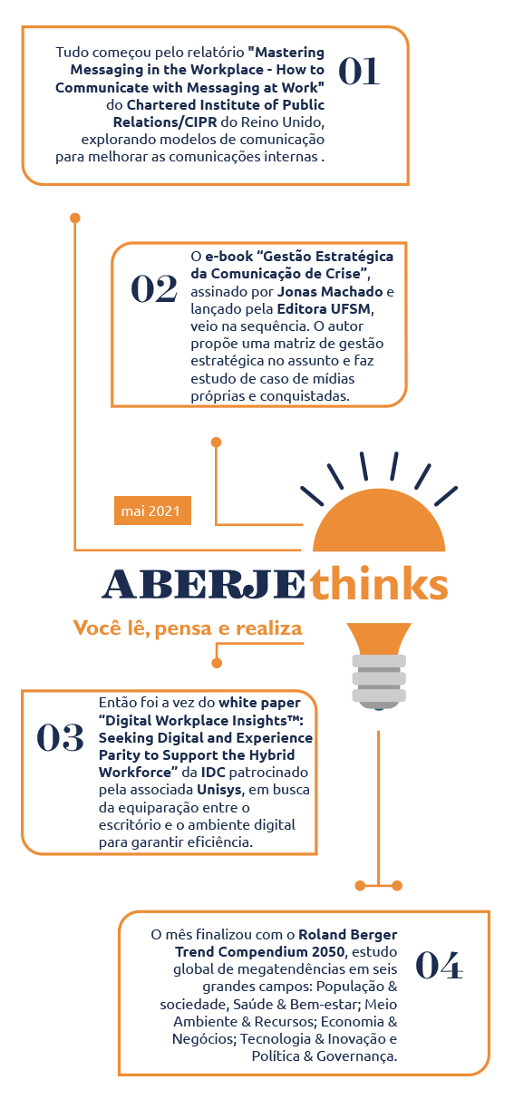 O projeto Aberje Thinks, que distribui semanalmente conteúdos estratégicos exclusivos para os associados, entregou em maio de 2021 materiais sobre comunicação interna, gestão de crise, trabalho híbrido e megatendências.