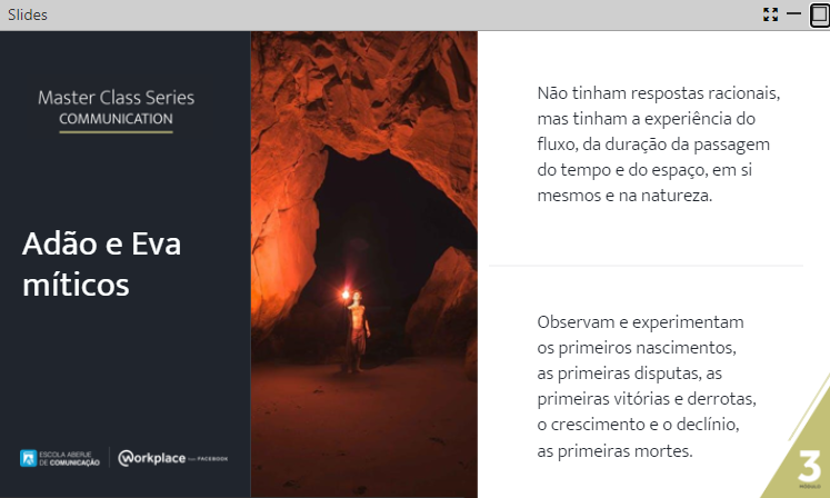 A primeiras narrativas míticas portanto, ressaltam a importância da experiência. “O que é vivido pela primeira vez relaciona-se com o tempo, o espaço e com o que o integra.Tudo isso memorizado e narrado constitui-se o que chamamos de primeira narrativa”. Nesse momento, Paulo faz um paralelo sobre a importância das experiências vividas no mundo organizacional, que marcam a memória das pessoas que dela fazem parte e as transformam. As narrativas que surgem desses processos são marcadas pela ligação entre aquilo que se faz e o que se diz; “o discurso alinhado à prática”.