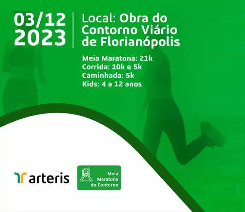 A Arteris, uma das maiores gestoras de rodovias do Brasil, continua com inscrições abertas para a “Meia Maratona do Contorno – Juntos pela Vida”, que já recebeu mais de mil inscritos de diferentes idades. O evento esportivo, marcado para dezembro deste ano, vai ocorrer nas pistas do Contorno Viário de Florianópolis, a maior obra do setor de infraestrutura rodoviária em andamento no país.