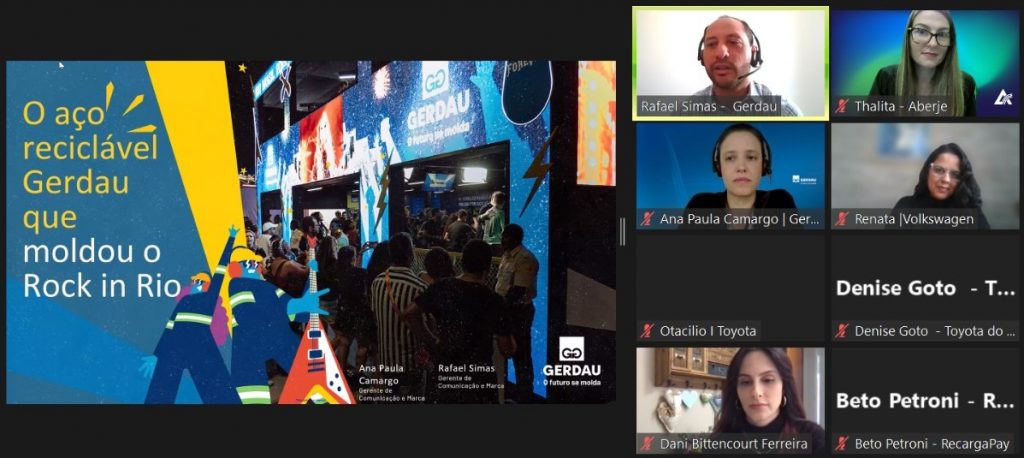 “A mensuração sempre vem para complementar, mas confiar que isso funciona é o primeiro passo”, explicou Rafael Simas, da Gerdau. Junto com Ana Paula Camargo, ele expôs o case do patrocínio do Rock in Rio pela Gerdau. Com o mote “O Palco Mundo se molda com aço Gerdau”, o palco principal do festival (o Palco Mundo) foi construído com aço 100% reciclado Gerdau.