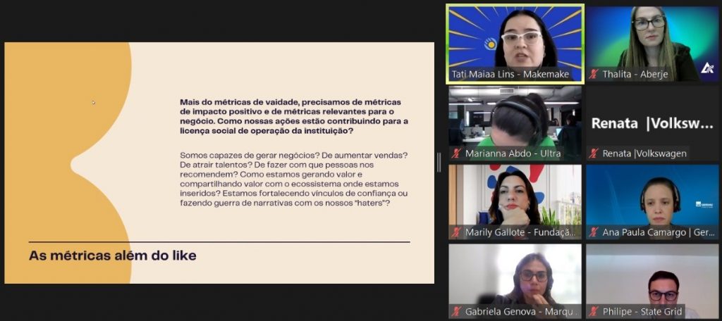 Thalita Dominato, da Aberje, saudou os presentes e apresentou Tatiana Maia Lins, fundadora e diretora executiva da Makemake, como vice-coordenadora do Comitê, que apresentou o tema “Mensuração de Reputação”.