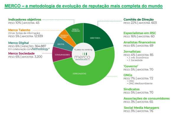 A metodologia também incorpora avaliações complementares relacionadas à reputação digital das empresas (Merco Digital) e à gestão de talentos (Merco Talento). Indicadores reputacionais aferidos por 45 empresas contribuem para a mensuração final dos resultados.