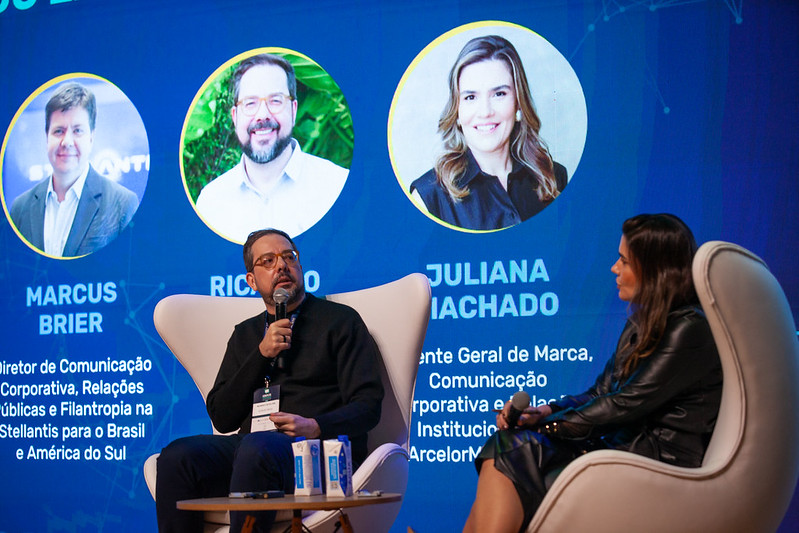 Com mediação de Juliana Machado Cardoso Matoso, gerente geral de Marca, Comunicação Corporativa e Relações Institucionais da ArcelorMittal Brasil e Conselheira Deliberativa da Aberje, participaram do debate Claudio Bruno, diretor de Inovação na Cortex; Marcus Brier, diretor de Comunicação Corporativa, Relações Públicas e Filantropia na Stellantis para o Brasil e América do Sul; e Ricardo Castellani, gerente sênior de Comunicação na Novo Nordisk.