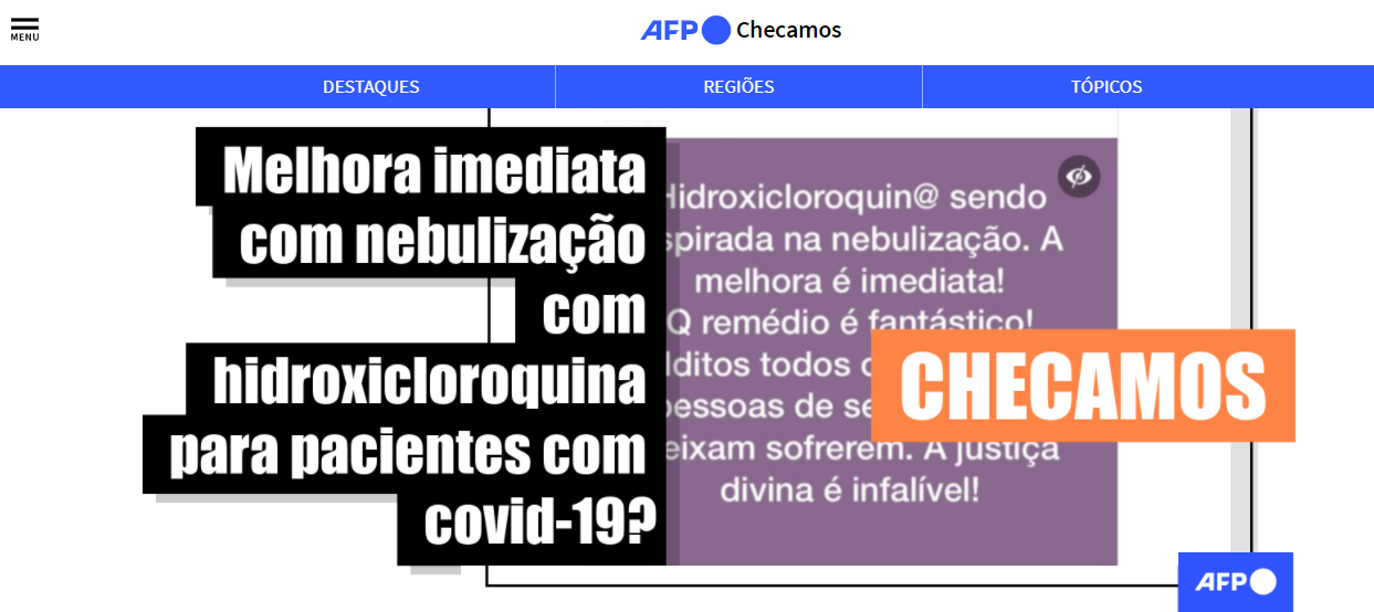 Publicações que promovem a nebulização com hidroxicloroquina no tratamento da covid-19 circulam nas redes sociais desde 25 de fevereiro passado, com mais de 33 mil compartilhamentos. No entanto, não há nenhum estudo científico que comprove a eficácia do procedimento e, segundo especialistas consultados pela AFP, o procedimento pode agravar o quadro da doença.