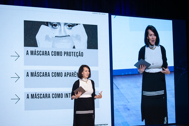 A partir da metáfora da máscara, que segundo ela sintetiza o espírito da época, Camila convidou a plateia a refletir sobre os sentidos possíveis desse símbolo na era da IA: proteção, aparência ou interface? Um QR code projetado no telão permitiu que o público participasse da dinâmica em tempo real. O resultado apontou “aparência” como o significado mais associado, revelando a inquietação com a linha cada vez mais tênue entre ilusão e realidade. “Interface” foi o segundo colocado, seguido por “proteção”.