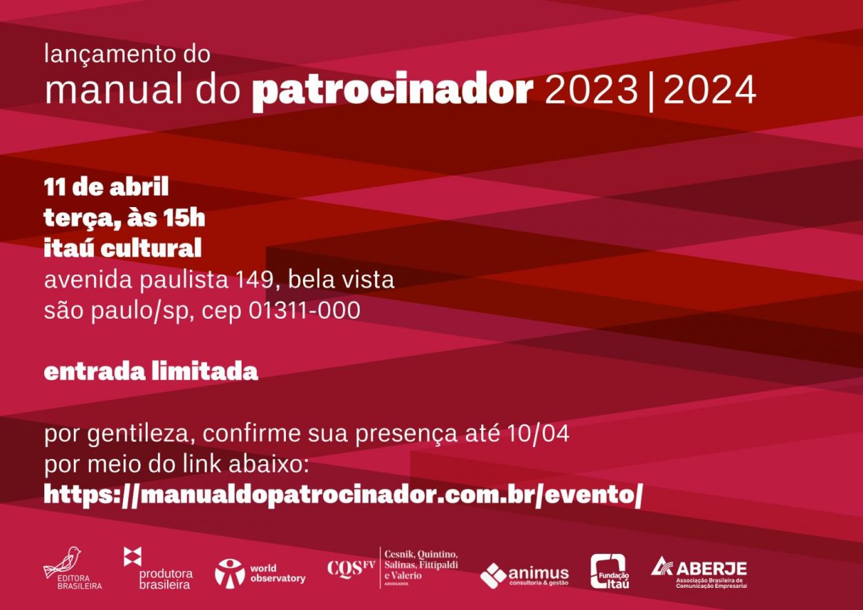 Para convidados, o lançamento do Manual do Patrocinador 2023|2024 acontece na próxima terça-feira, 11 de abril, das 15h às 17h, no Itaú Cultural, em São Paulo. O guia de 112 páginas é uma correalização entre CQS/FV Advogados, Editora Brasileira, Produtora Brasileira, World Observatory e Animus Consultoria. Fundação Itaú e Associação Brasileira de Comunicação Empresarial (Aberje) apoiam a iniciativa.