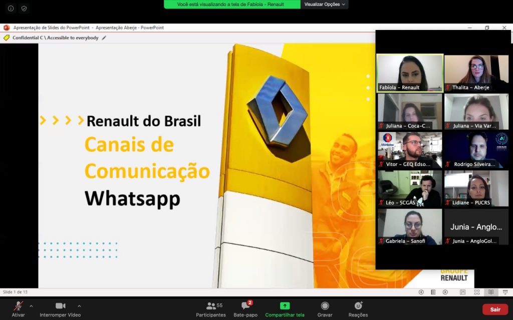 O WhatsApp é um dos aplicativos de mensagens instantâneas mais populares no Brasil e no mundo e algumas organizações brasileiras vêm adotando a funcionalidade Business para facilitar a comunicação com seus colaboradores. A fim de promover a troca de experiências do uso da ferramenta em ambiente corporativo, foi realizado um encontro de benchmarking online, no dia 13 de maio, com profissionais de Comunicação da Companhia Brasileira de Alumínio (CBA), da Renault, da PUCRS, da Volvo e da Usiminas. Na ocasião, as empresas associadas à Aberje apresentaram suas boas práticas para 58 profissionais da área de Comunicação, de oito estados brasileiros participantes.