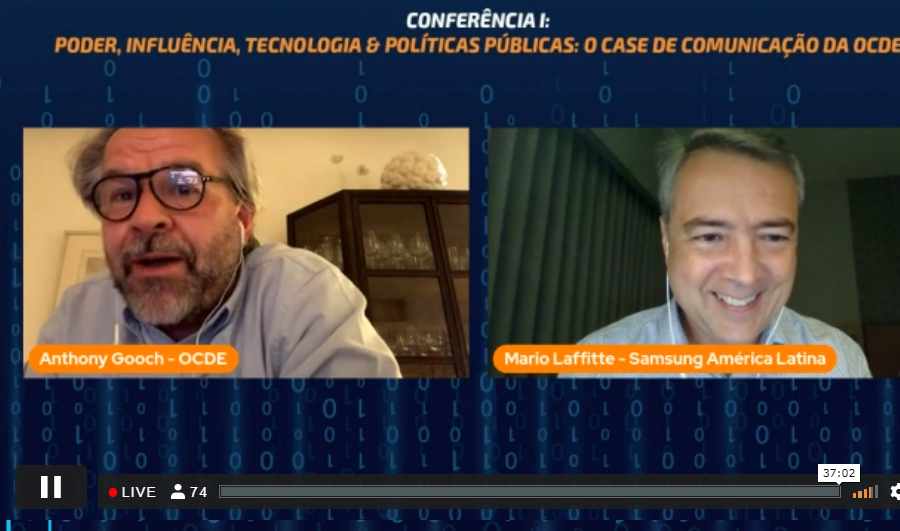 O painel “Poder, Influência, Tecnologia & Políticas Públicas: o case de Comunicação da OCDE” debateu o papel da organização no enfrentamento à crise gerada pela pandemia da Covid-19, e teve mediação de Mario Laffitte, VP de Relações Governamentais, Comunicação Corporativa, Jurídico, Compliance e Responsabilidade Social Corporativa na Samsung América Latina.