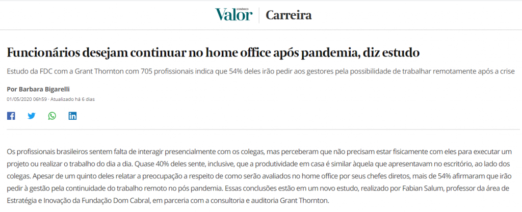 Funcionários desejam continuar no home office após pandemia, diz estudo da nossa associada FDC com a Grant Thornton. 54% deles irão pedir aos gestores pela possibilidade de trabalhar remotamente após a crise. Veja mais em matéria do Jornal Valor Econômico: