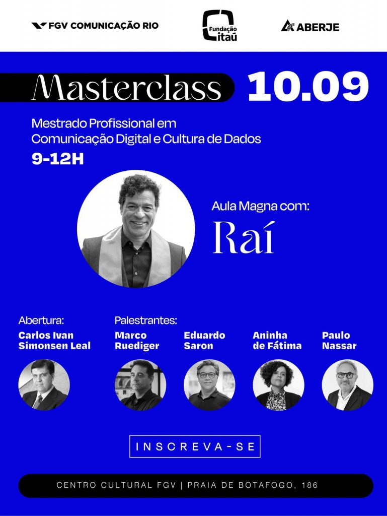 Na próxima terça-feira (10), o ex-jogador de futebol Raí fará a masterclass que marca o início das aulas da primeira turma do Mestrado Profissional em Comunicação Digital e Cultura de Dados – resultado de uma parceria entre FGV Comunicação Rio, Aberje e Fundação Itaú. O esportista é Mestre em Políticas Públicas pela Sciences Po – Instituto de Estudos Políticos de Paris.