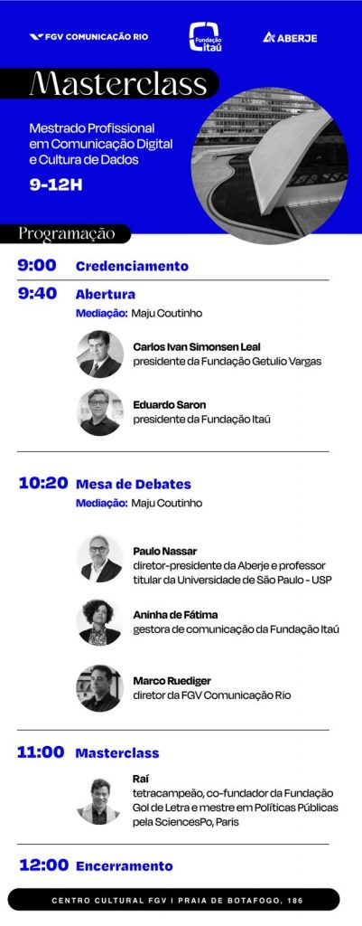 O evento será realizado no Centro Cultural da FGV, no Rio de Janeiro, das 09h às 12h, com abertura do presidente da FGV, Carlos Ivan Simonsen Leal. Também participarão o diretor-presidente da Aberje professor titular da ECA-USP, Paulo Nassar; o diretor da FGV Comunicação Rio, Marco Ruediger; o presidente da Fundação Itaú, Eduardo Saron; e Ana de Fátima, gerente de comunicação institucional e estratégica da Fundação Itaú.