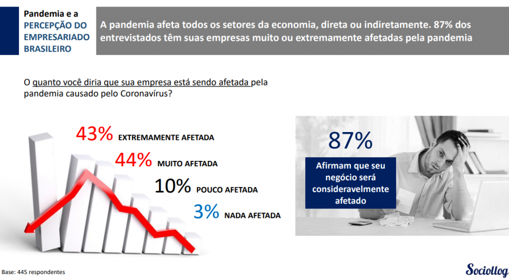 A Sociollog aplicou a pesquisa “Pandemia e a percepção do empresariado brasileiro” na primeira quinzena de abril de 2020 e trago aqui o relatório final – quase 90% dos entrevistados estão sendo muito afetados pela crise.
