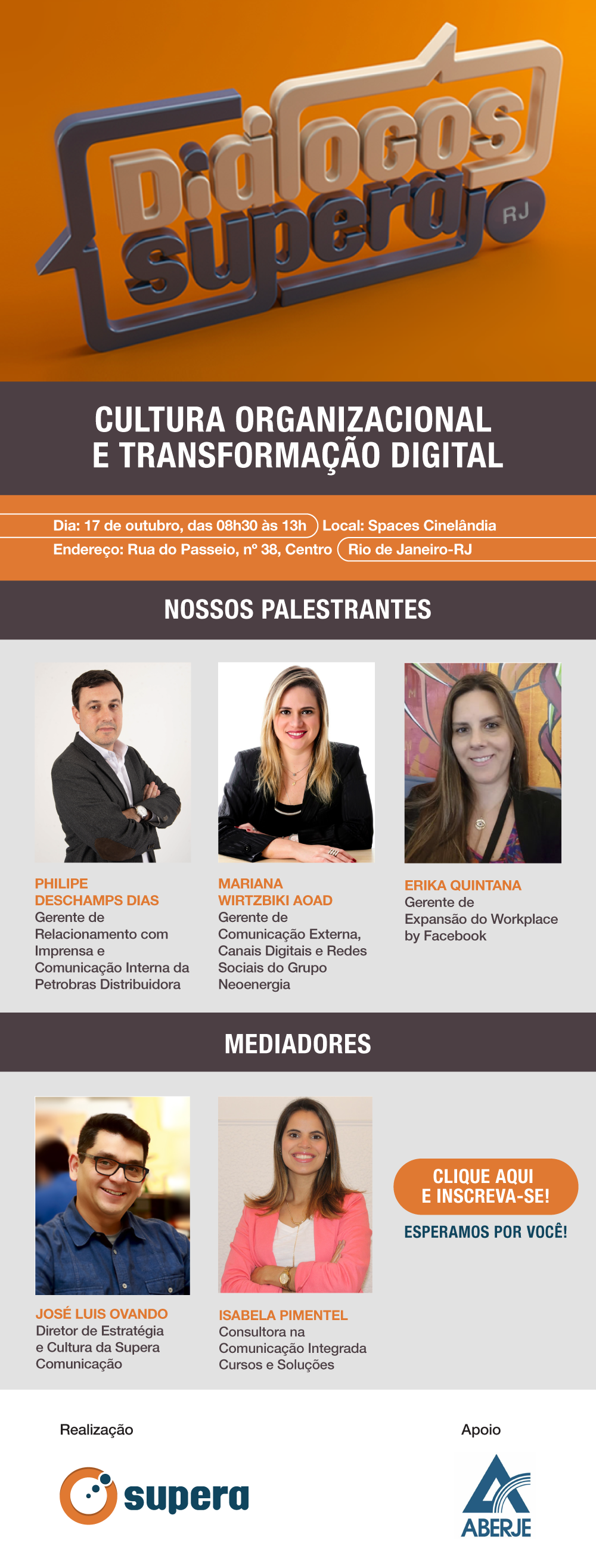 Mediado pelo diretor de Estratégia e Cultura da Supera Comunicação, José Luis Ovando, e pela consultora na Comunicação Integrada Cursos e Soluções, Isabela Pimentel, o evento promoverá reflexões sobre temas como: