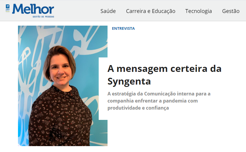“A mensagem certeira da Syngenta” é o tema de matéria na Revista Melhor Gestão de Pessoas, mostrando a estratégia da Comunicação interna para a companhia enfrentar a pandemia com produtividade e confiança, tendo como fonte Carolina Dalanezi, Head de Comunicação Interna da nossa associada Syngenta.