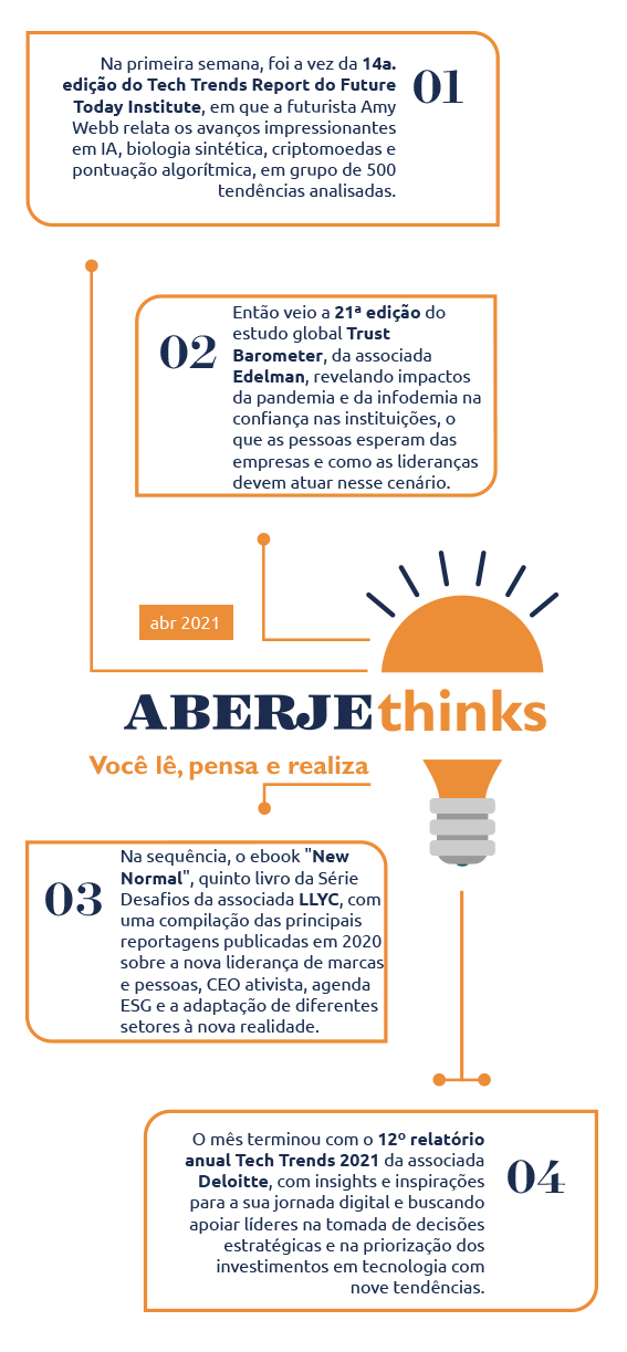 Os conteúdos de suporte à tomada de decisão – relatórios de pesquisa, e-books, súmulas informativas e/ou infográficos – enviados semanalmente no projeto Aberje Thinks, trouxeram mais inputs relevantes no mês de abril de 2021. Foram materiais sobre tendências em tecnologia, confiança, infodemia e nova liderança de marcas e pessoas.